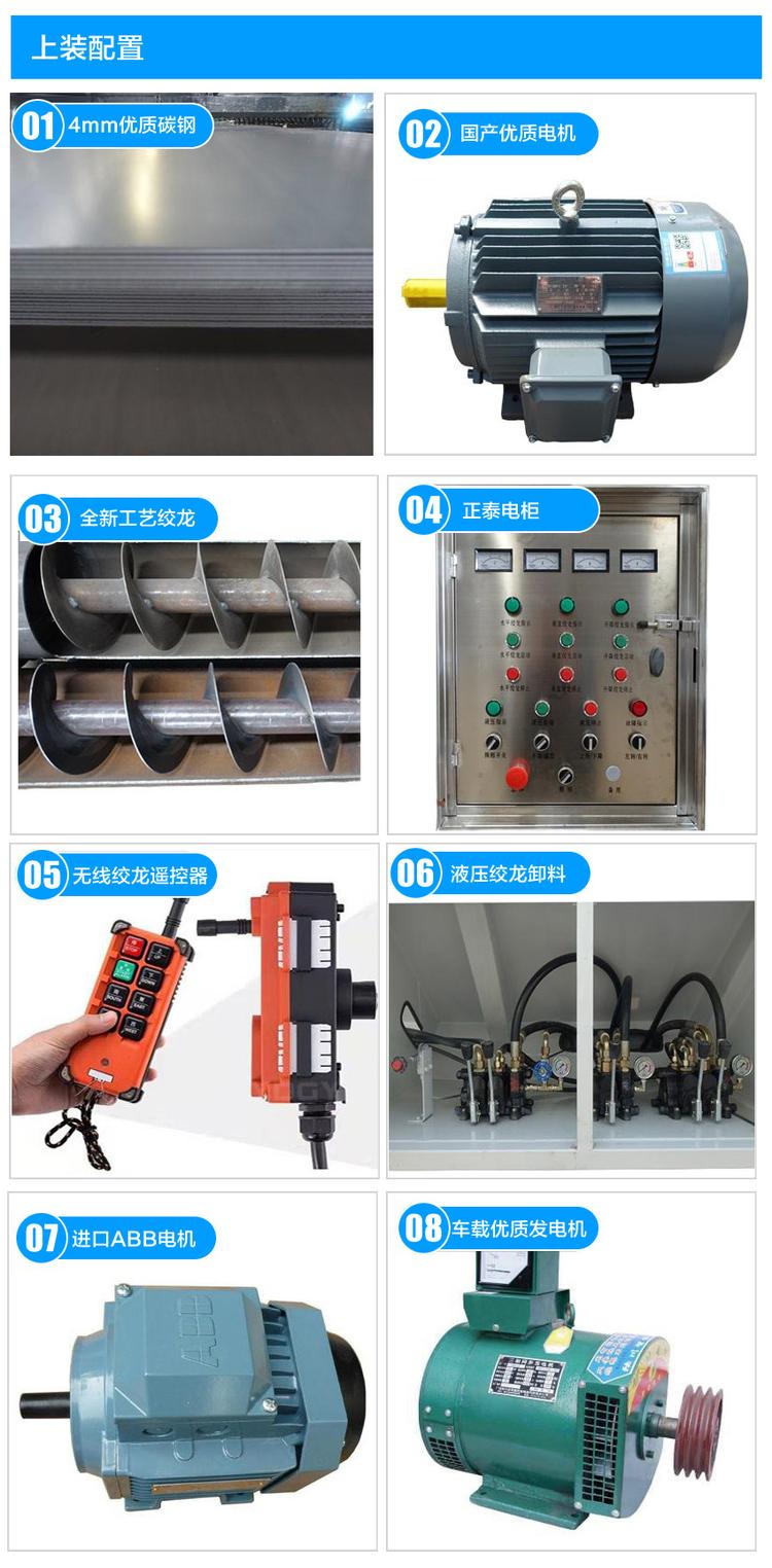 飼料車卸料裝置:外接380 V 電源, 外接電源成本低,環保,車輛損耗小, 卸料每分鐘500-700 Kg ,4 個5.5級進口西門子電機,